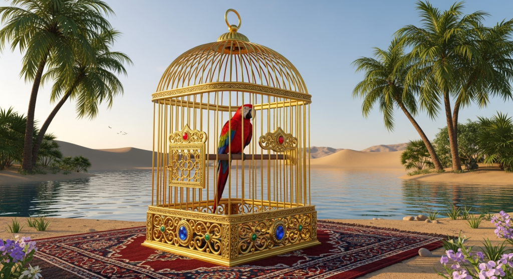 Once upon a time, there lived a merchant at the far end of the Arabian oasis. The merchant kept a talking parrot in a golden cage, whom he loved very much. The bird, however, despite the luxury and comfort, longed for freedom. One fine day, the merchant had some business in the land of the Far East, near the forest. Before traveling, the merchant asked if the parrot wanted anything from its homeland. The parrot requested he tell the forest parrots it was happy yet missed them.